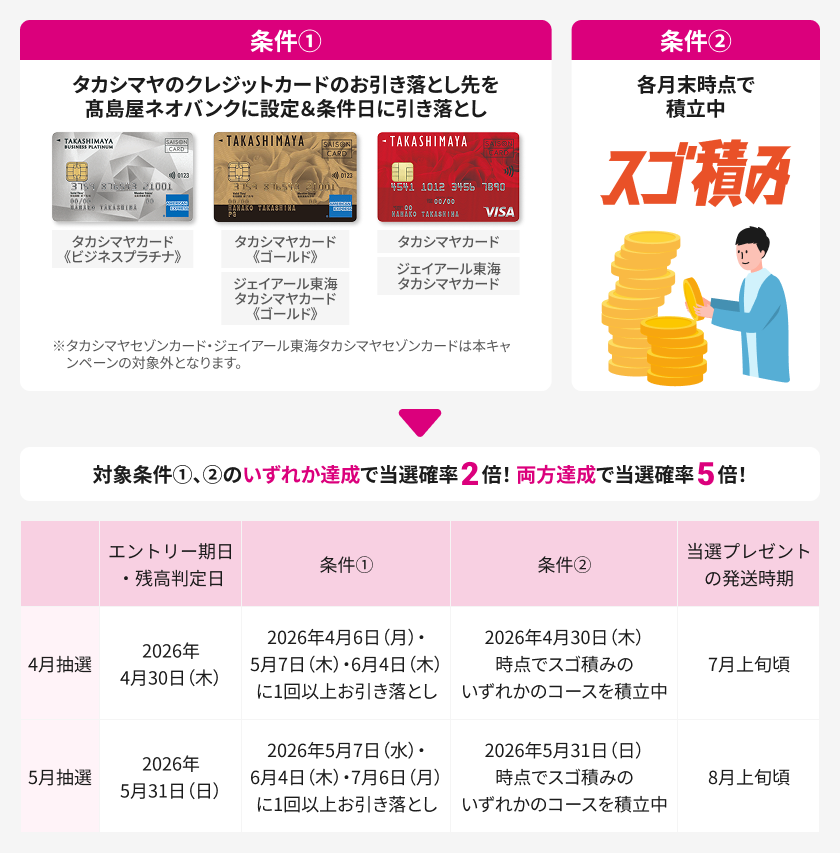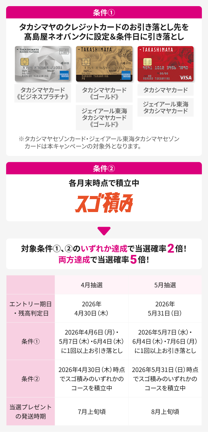 さらに、タカシマヤのクレジットカードの口座振替やスゴ積み会員のかたは当せん確率がアップします。