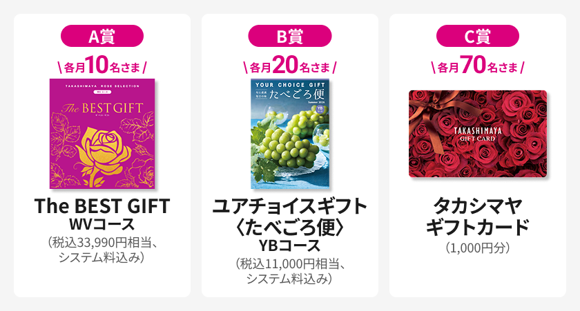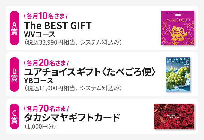 A賞~C賞のカタログギフトもしくはギフトカードを抽せんで各月合計100名さまにプレゼントいたします。