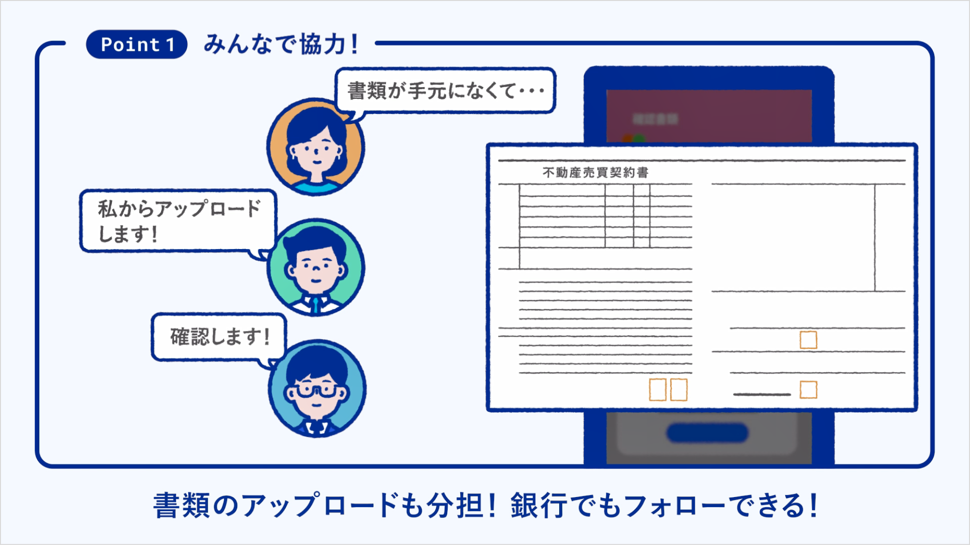 書類のアップロードもお客さまだけではなく、不動産事業者と協力しながら対応できます。物件関係書類は不動産事業者がアップロードするなど役割分担することでスムーズにお手続きを進めることができます。