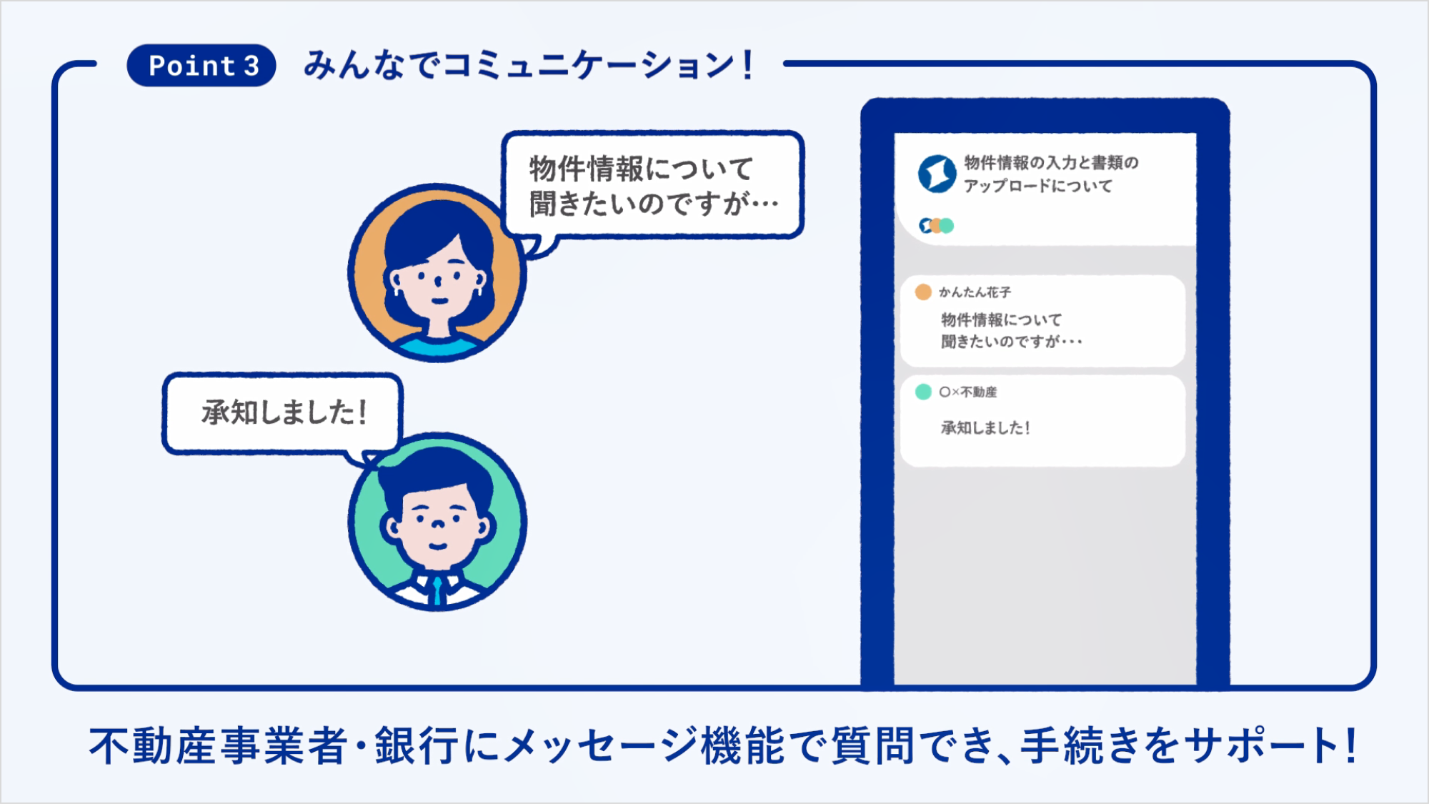 メッセージ機能を使い、お申込み情報の入力や必要書類の準備など不明点を不動産事業者や住信SBIネット銀行代理店担当者に質問することで、プラットフォーム上でお困りごとを解消できます。
