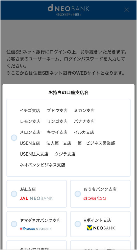 お持ちの口座支店名を選択してください。