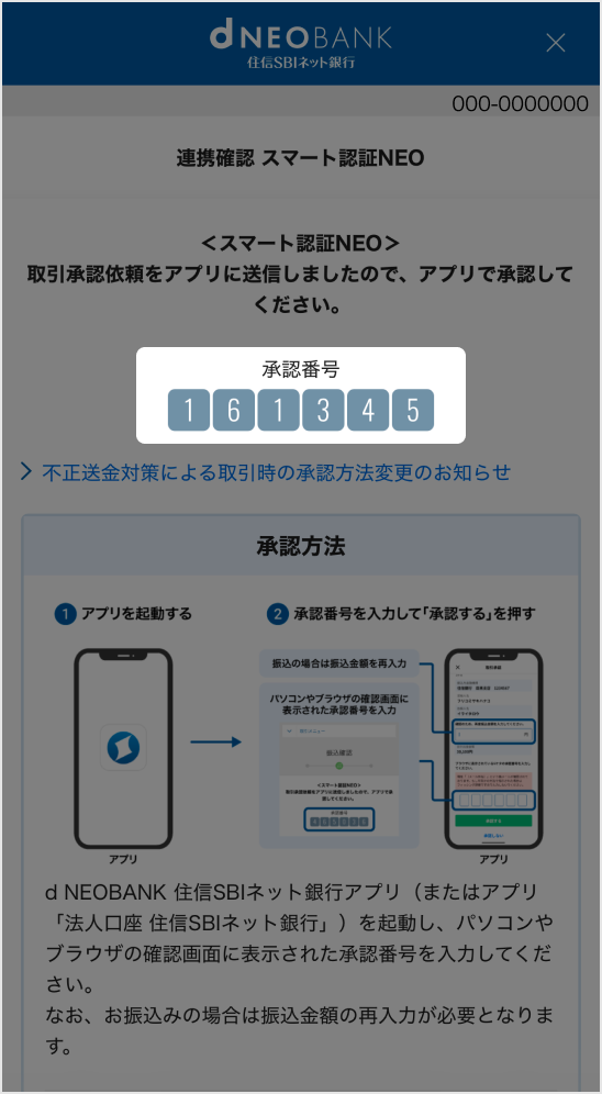 パソコンやブラウザに承認番号が表示されます。